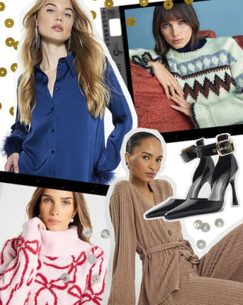 Our ideal Christmas Day ‘fit is fun, festive and comfy. The big day’s about celebrating with your nearest and dearest, and also about eating as many roast potatoes as possible, after all. Our Christmas jumpers are non-negotiable: take your pick from Fair Isle styles, all-over sparkle, or colourful, playful pieces from our ever popular collab with Nephthys Illustrated. Flat shoes are your friend today, but they should still be special – embellished slingbacks or dressy ballet pumps. Finesse the festive ensemble with some obligatory sparkle, like diamante star jewellery or pearl and crystal-studded hair accessories.